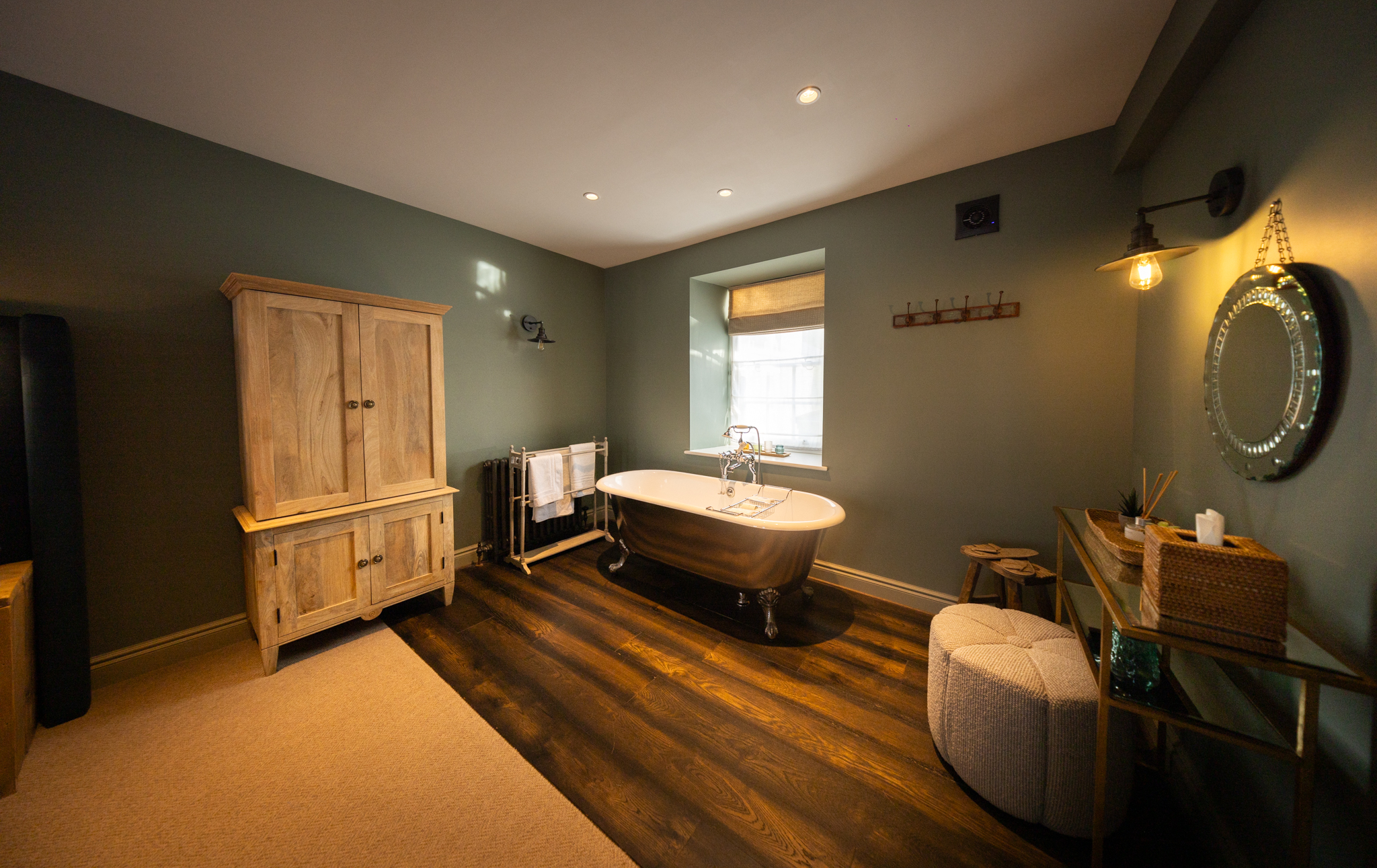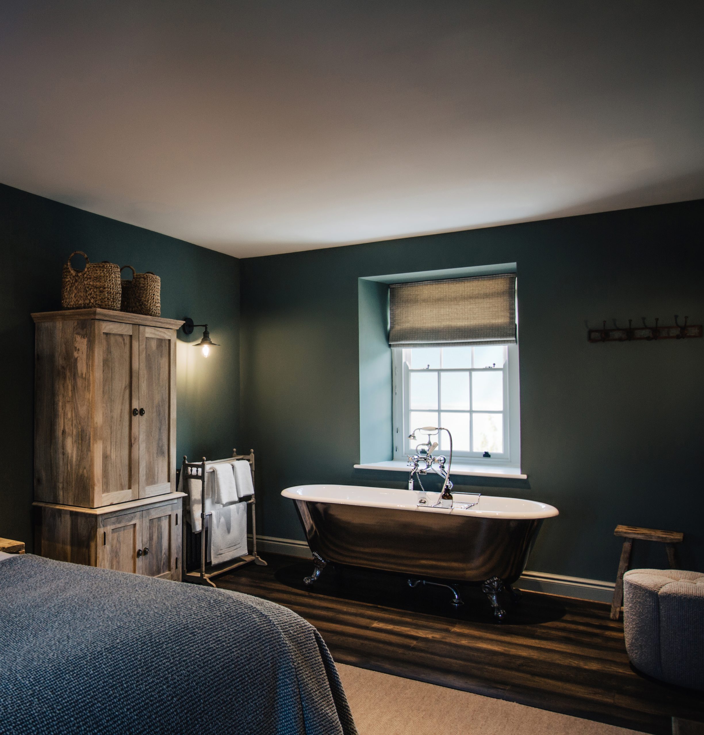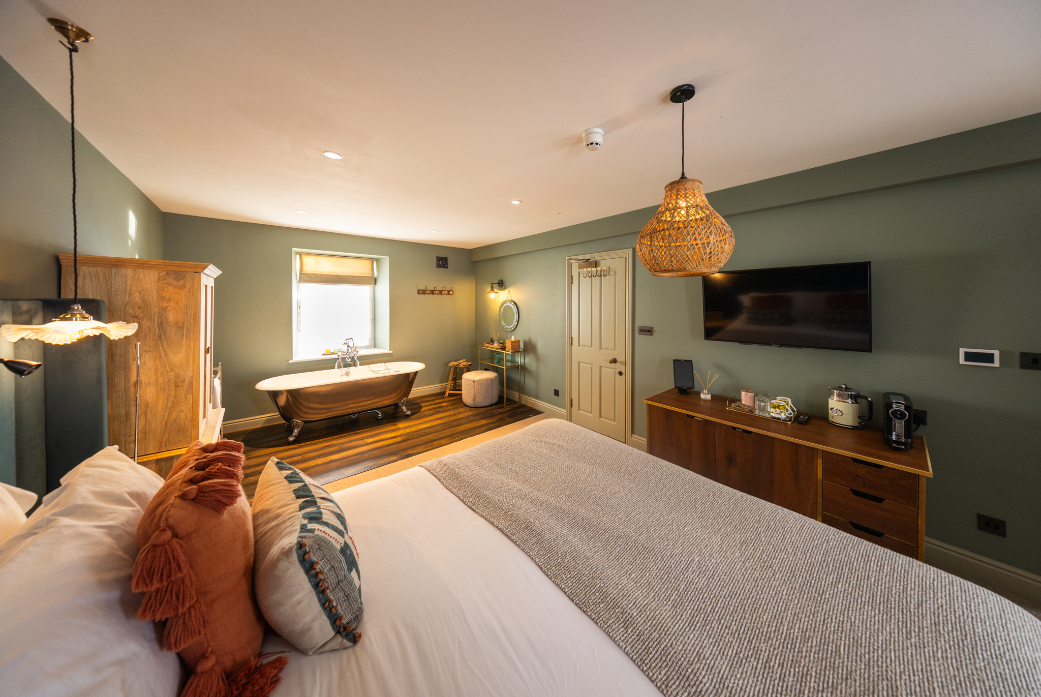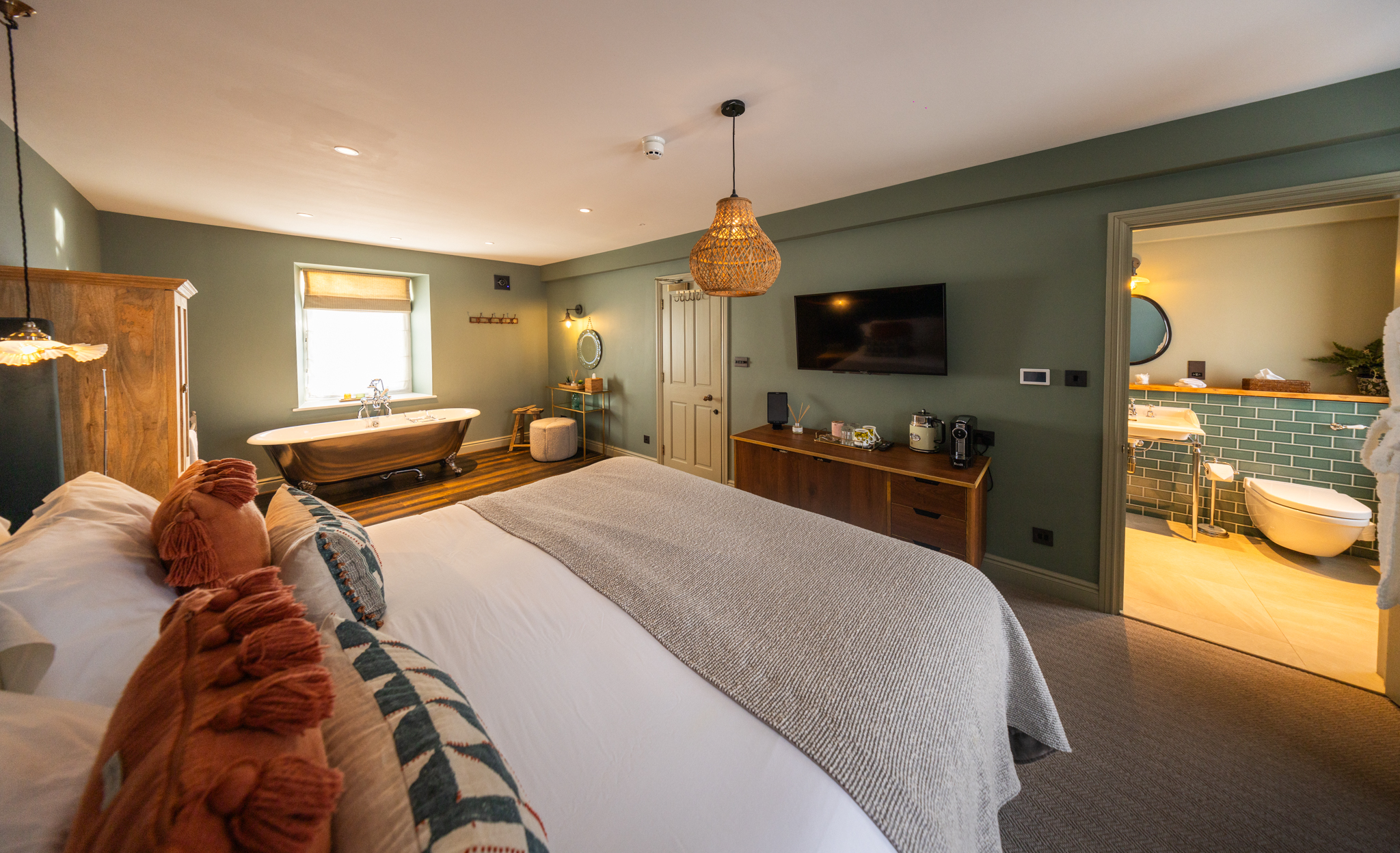 The luxurious and spacious open-plan bedroom features a super king bed, that can be arranged as twin beds, and a freestanding bathtub by the window, perfect for relaxing afternoon soaks. The room opens to the en-suite bathroom with a walk-in shower.