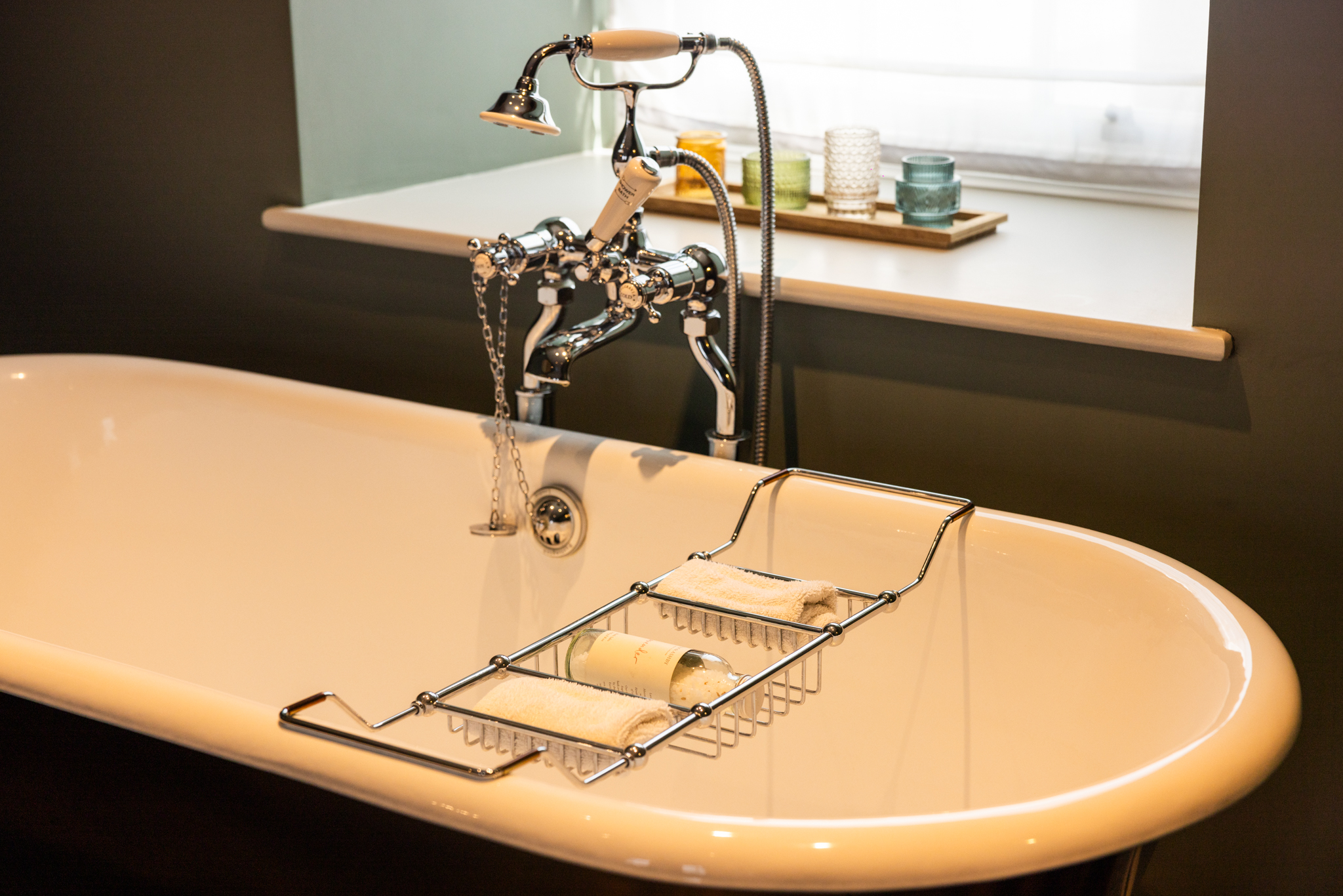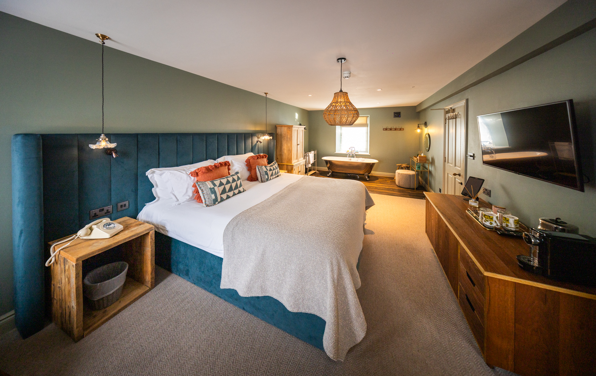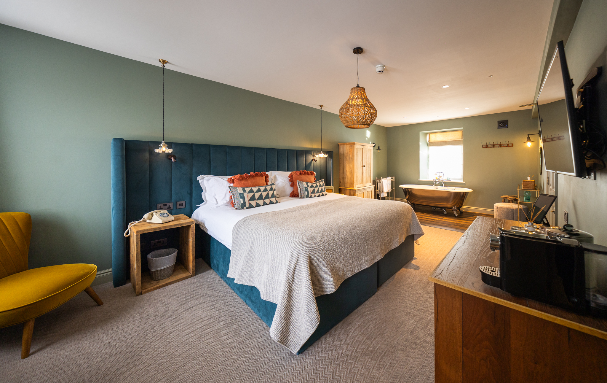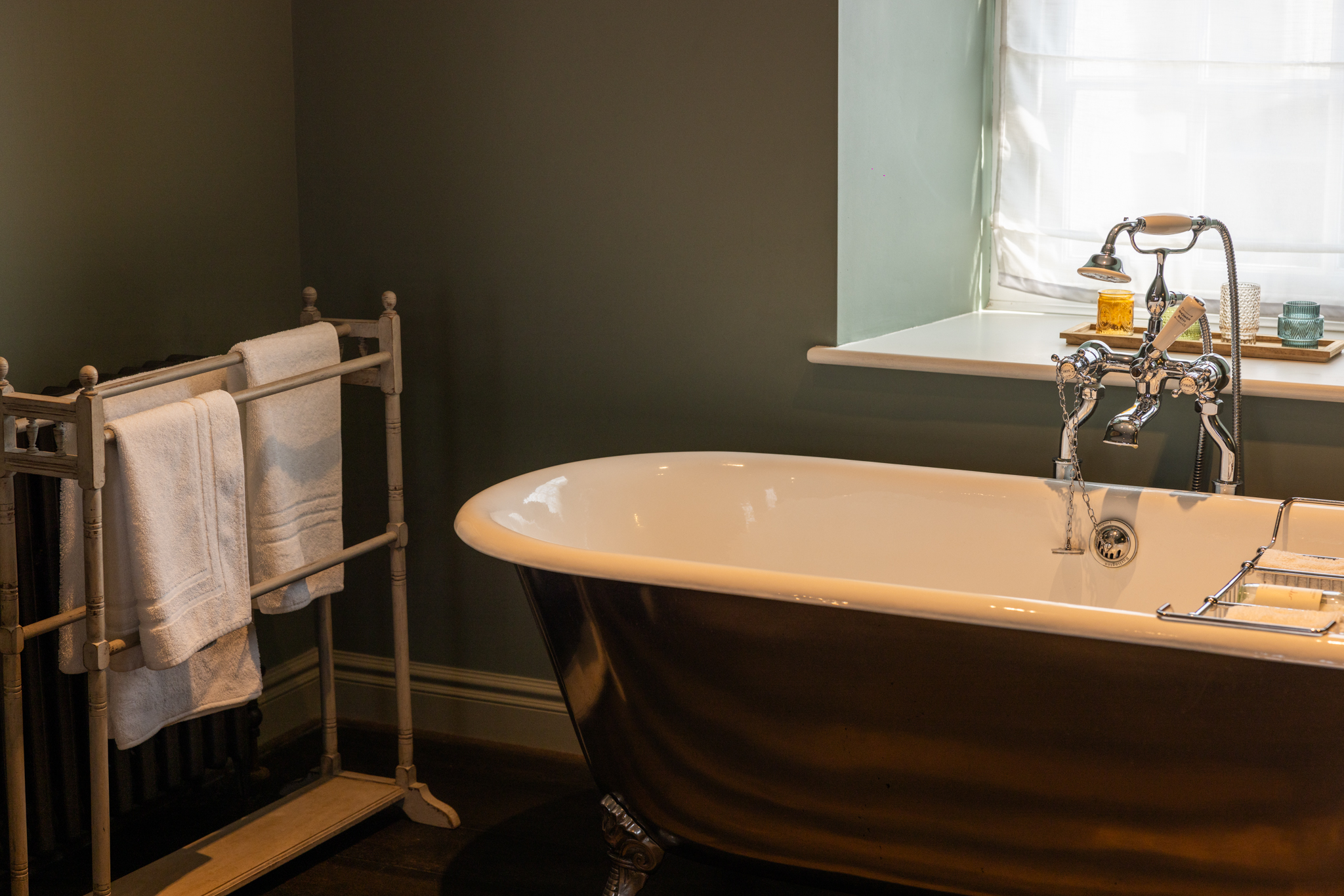 The luxurious and spacious open-plan bedroom features a super king bed, that can be arranged as twin beds, and a freestanding bathtub by the window, perfect for relaxing afternoon soaks. The room opens to the en-suite bathroom with a walk-in shower.