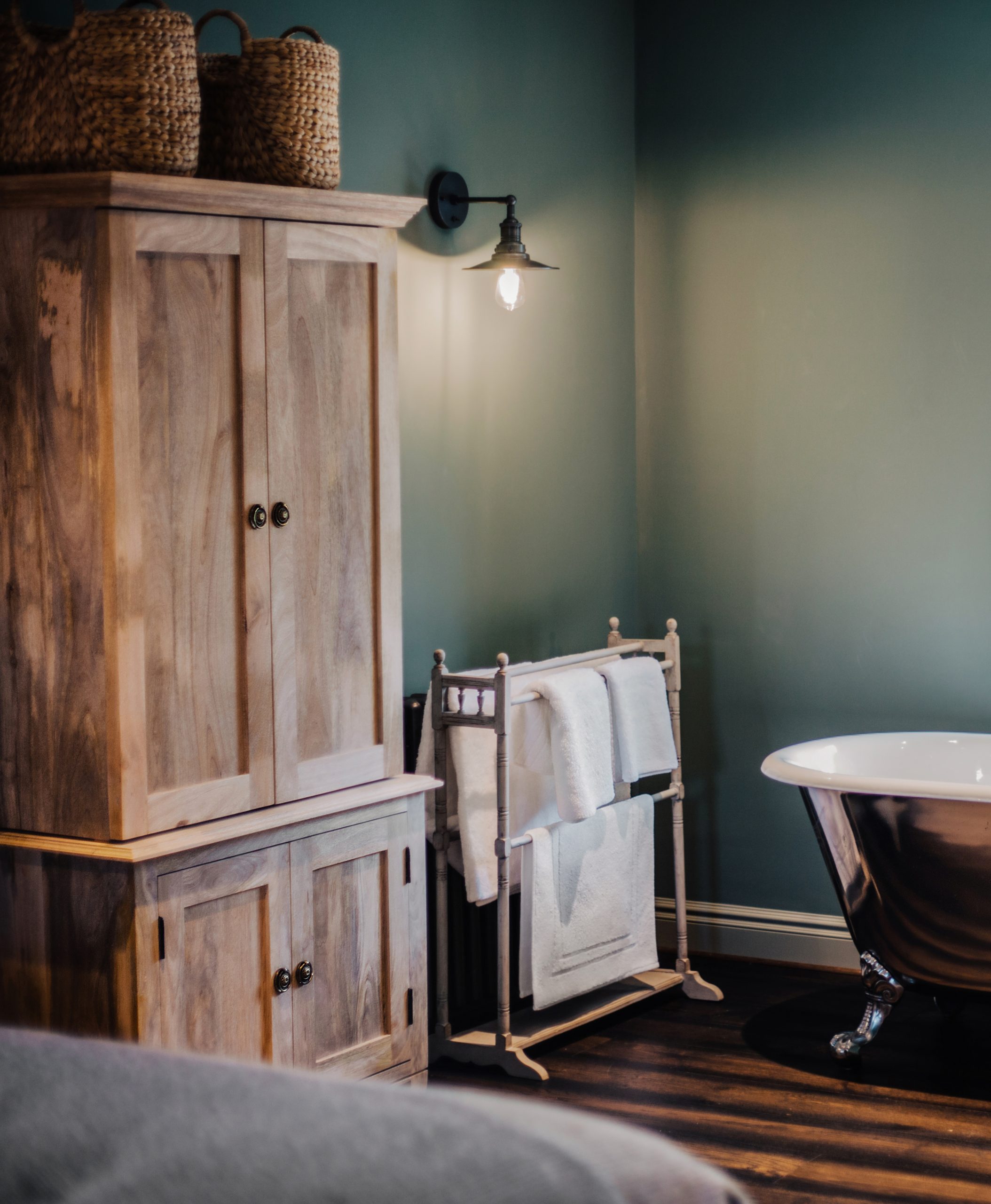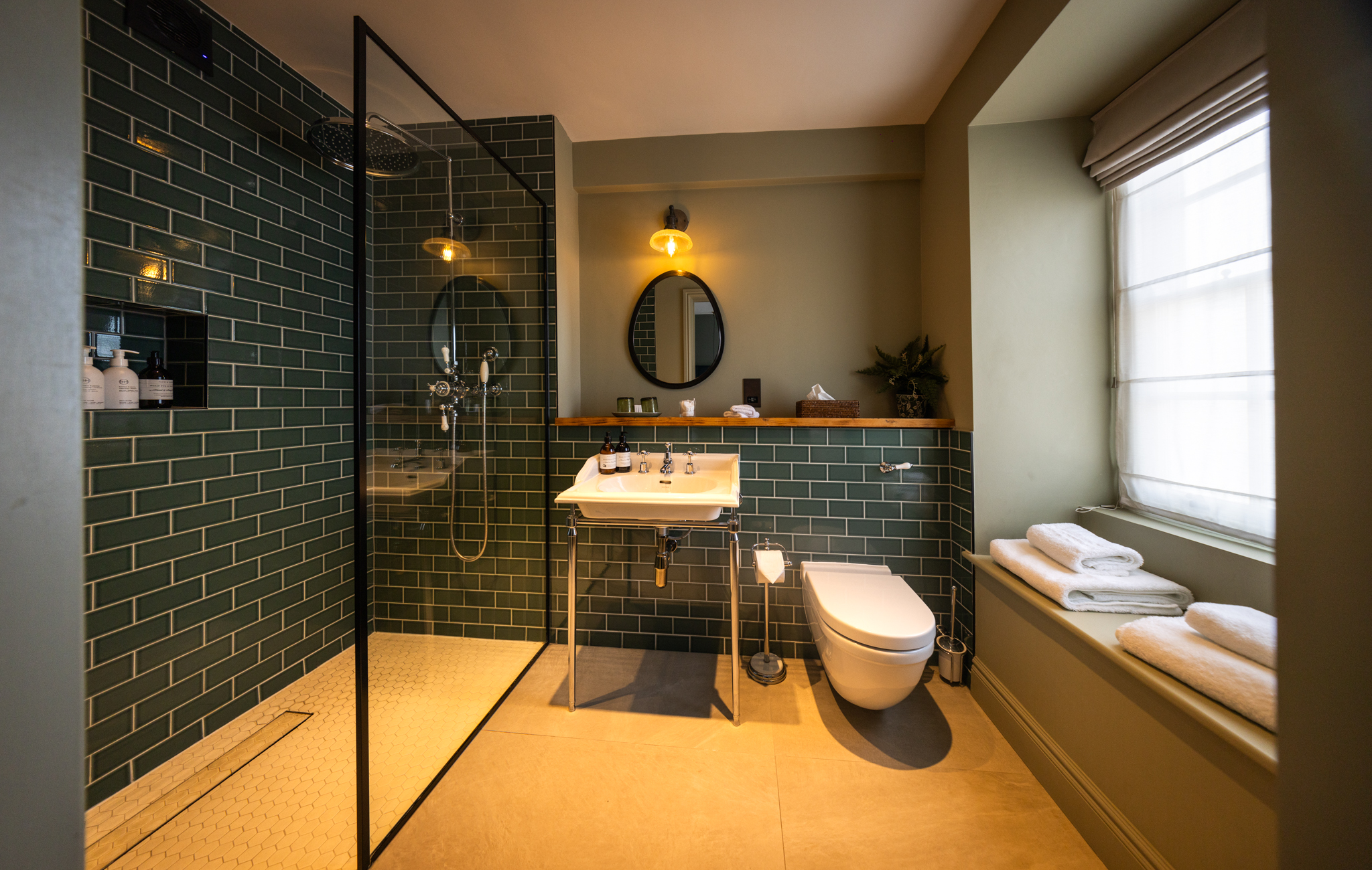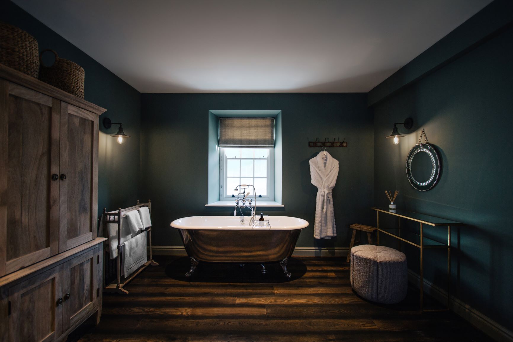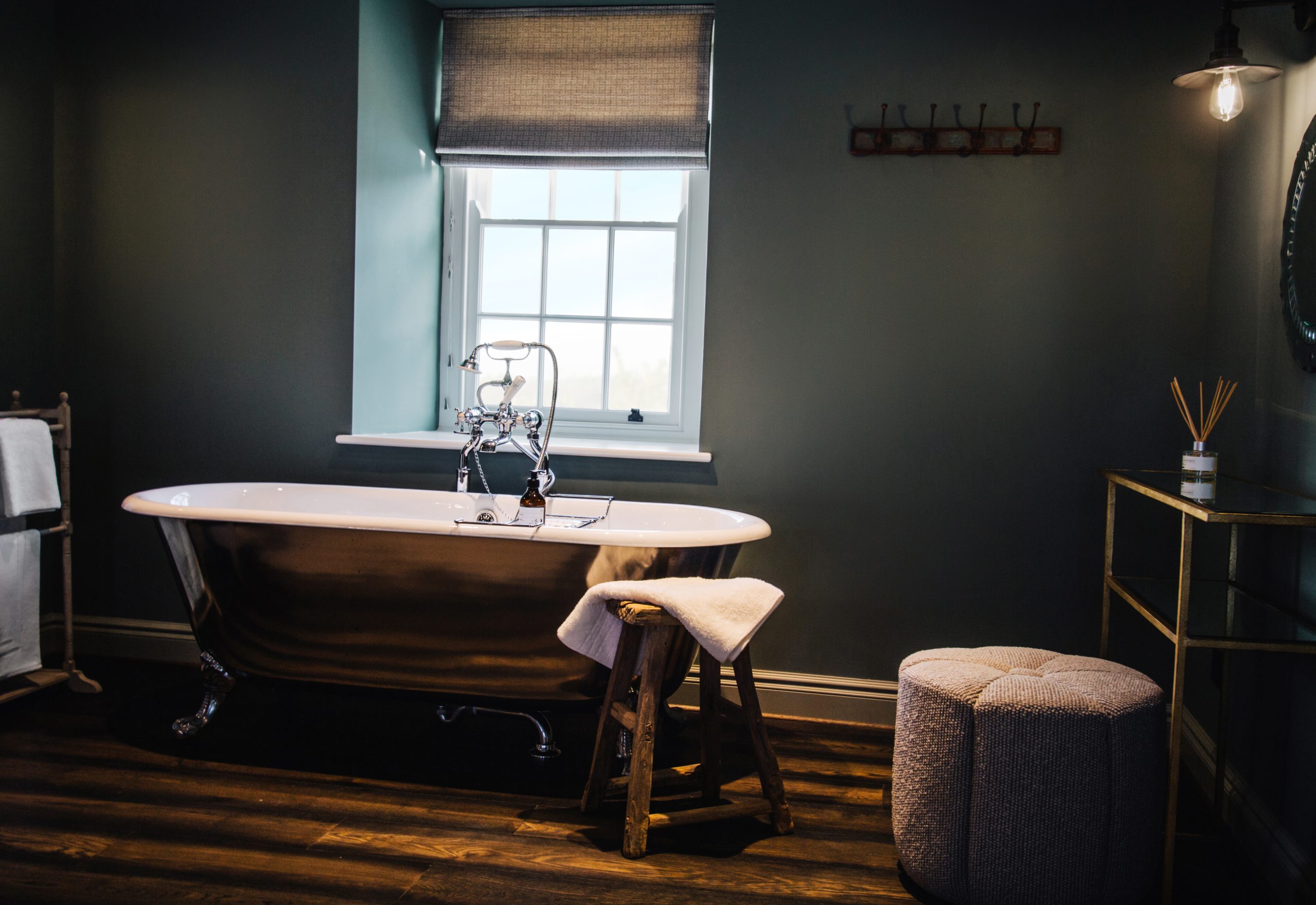 The luxurious and spacious open-plan bedroom features a super king bed, that can be arranged as twin beds, and a freestanding bathtub by the window, perfect for relaxing afternoon soaks. The room opens to the en-suite bathroom with a walk-in shower.